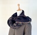 表情のある黒系のウール糸で織りました。ふさは切り落とし、ファンシーヤーンで縁編みをしたので、既製品にはない手織りならではの楽しさを味わっていただけると思います。