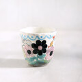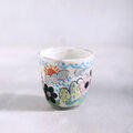 黒土に白化粧を刷毛で手塗りし素焼きの後、その上から彩色して焼き上げたフリーカップです。