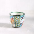 黒土に艶消しの白い釉を掛けたうえに彩色した色絵カップです。