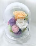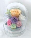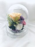 透明なドームの中にクリームピーチ色の薔薇に白薔薇、ダリアやミニ薔薇などを使用しました。
