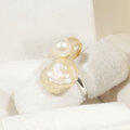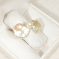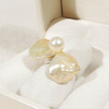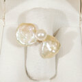 リボンの様な形の個性的な淡水パール(バロック)と、照りの綺麗なアコヤ真珠の指輪です。本物のバロックパールを使っていますので、世界に一つしかない形の真珠を使った、一点物のジュエリーです。