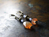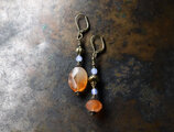 グラデーションが見られるカーネリアンとブルー瑪瑙、蓮華&手毬ブラスを繋いだアンシメトリーなピアスです。
