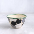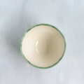 口縁には滑らかな緑色の織部釉を、内側は白土の土味を生かす透明釉を掛けてます。