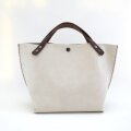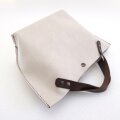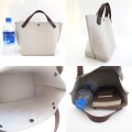 ◎両サイドの底マチの幅を広く取り扇状のシルエットにマッチする幅広でショートなハンドルを