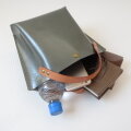 ◎両サイドの底マチの幅を広く取り扇状のシルエットにマッチする幅広でショートなハンドルを