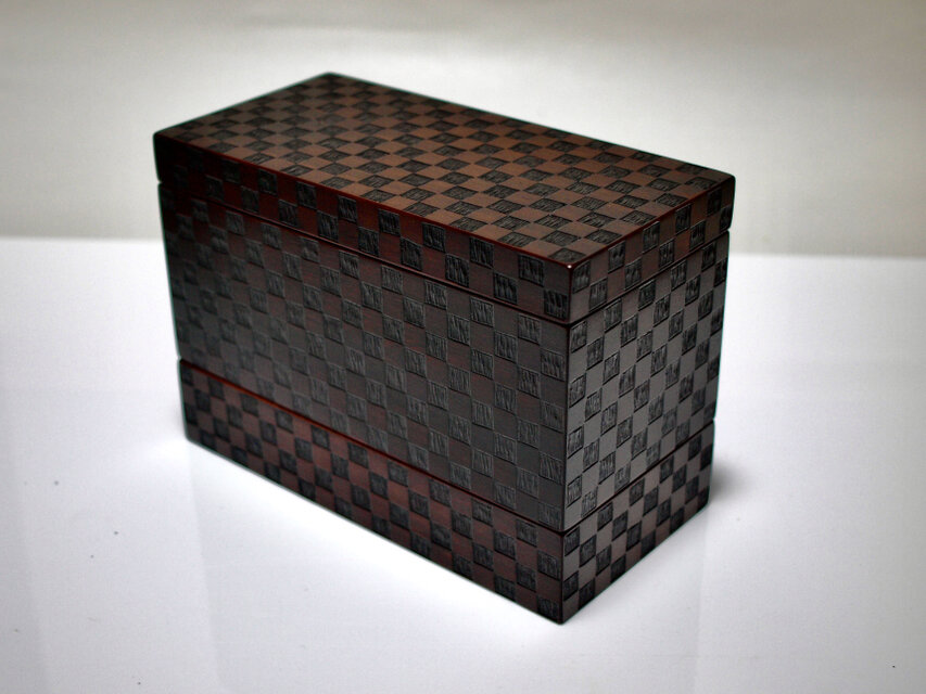漆塗りの作品は、塗り直すことも可能ですので、お気軽にご相談ください。桜材を使用した二段飾箱。