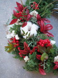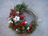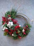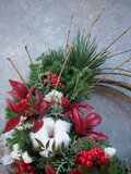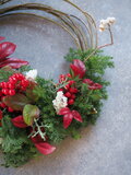 瀬戸内の森で育った柳の枝に針葉樹をふんわりと紡ぎ、南天や松など和風の植物を添え、華やかで印象的なハーフリースに仕立てました。