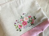 しっかりめのアイボリーのコットンリネンにお花の刺繍を施した巾着です。