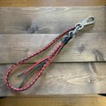 2色(黒×赤)の革紐を素材に使用して四つ編みにしておりフリンジ側にはOリングと小型ナスカン、逆側には大型ナスカンをそれぞれの先端に配置しています。