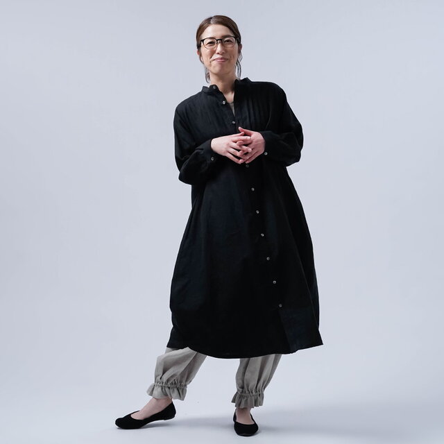 麻 Linen リネン リネンドレス リネンワンピース リネンワンピ シャツワンピ シャツ ロングシャツ 前開き 羽織 アウター カーディガン カーデ 着こなし 重ね着 ママ ママコーデ 無地 無地ワンピ ブラック 黒色 黒