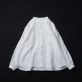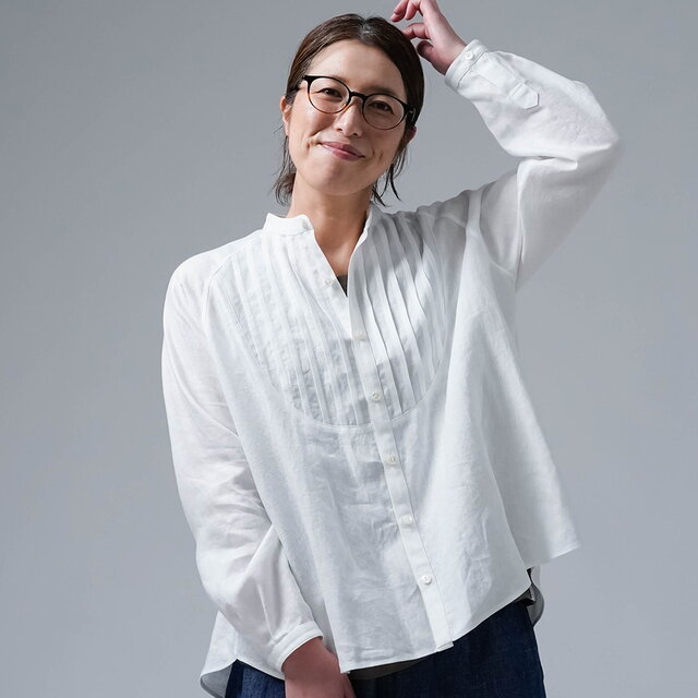 肩幅広めな私にもってこいのピンタックシャツです。ラグラン曲線を少し丸みを出して肩の印象を少なくしています。なのでピンタックの存在感がハンパなく一枚で正解が出るシャツです!またwafuスタンドカラーはなんとも言えない女性らしさがあって私は好きです。私の好きを組み合わせて作ってみました。着丈は少し短くしているのでミニ子さんにも合うと思います。肩を抜くともっと着丈は短く感じるのでコーデによって楽しんでください。着丈は骨盤下、袖丈は手首です。