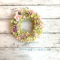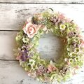 淡いピンクのバラと可愛らしいカモミールを優しい色合いに仕上げたリースです。