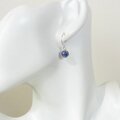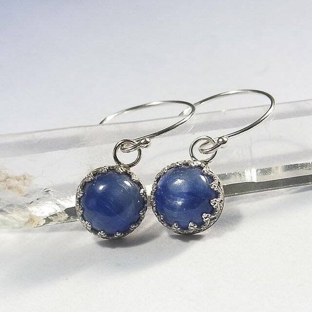 美しい青のまん丸カイヤナイトをレース飾りで留めたシンプルなピアスに仕上げました。
