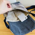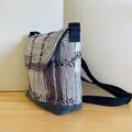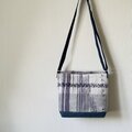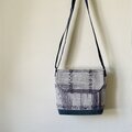 白に藤紫の入った裂き織り布を使い、ここ最近、定番として定着している、メッセンジャーバックを久しぶりに作ってみました。