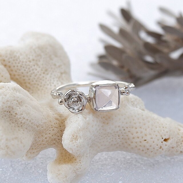 ローズクォーツに青みを足したような、不思議な色合いが美しいラベンダークォーツを、薔薇をあしらったリングに仕上げました。
