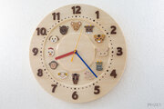 時刻の数字には、マホガニーからひとつずつ切り出した数字を使いました。数字に陰影がつくので、大きなお部屋や高い天井のお部屋でも時刻が大変見やすくなっています。分・秒目盛りは、マホガニーの丸棒を埋め込むデザインにし、5分おきにやや大きめのものにして、時刻を読み取りやすいようにしています。可愛い十二支は、ネズミ:アガチス、牛:ウオルナット、虎:ケヤキ、うさぎ:トチ、辰:パロサント、ヘビ:ブナ、馬:マホガニー、羊:メープル、猿:ペアウッド、鶏:メープル、犬:アユース、猪:アサメラをそれぞれの形に切り出し、レーザーで刻印、アクリル塗料・シルク印刷で仕上げました。針は、小さなお子様にも説明しやすい赤、青、黄の3色としました。