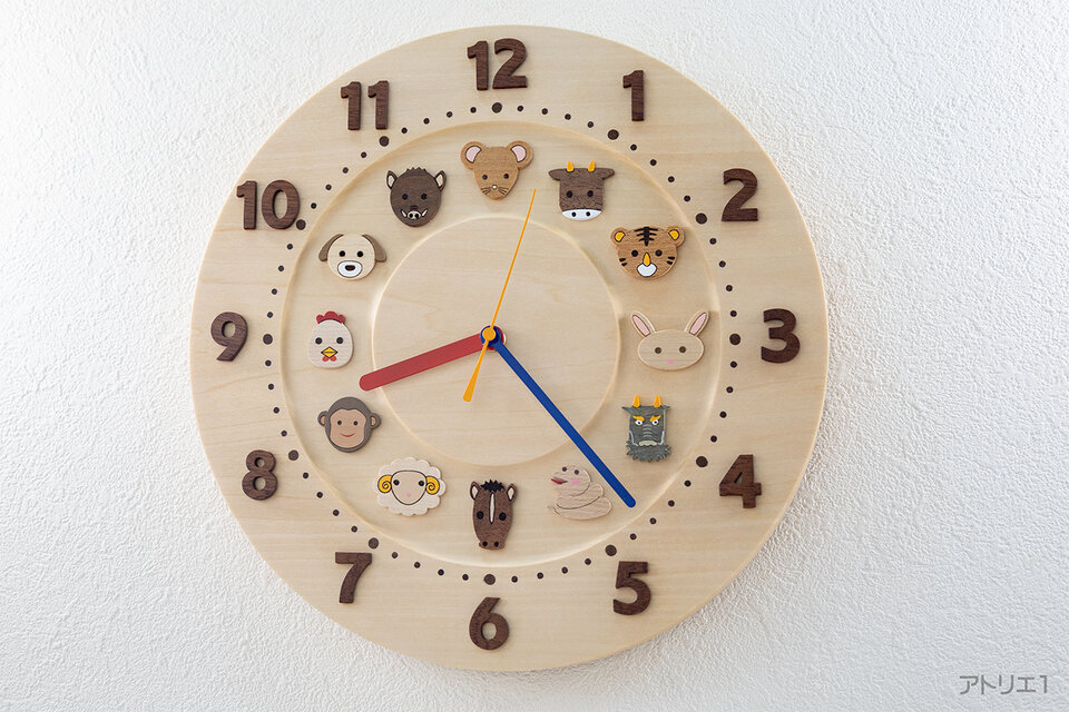 子供たちにもわかりやすい可愛い十二支がいるシナの掛け時計です。