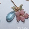 片方にはスカイカイヤナイトを留めたワイヤーにチェーンを通し、インカローズとグリーンのジルコンを下げました。