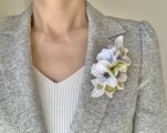 少しツヤのあるホワイト系の花と落ち着いたグリーン系を合わせた綺麗系で華やかなコサージュです。