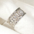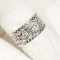 K18ホワイトゴールドをたくさん使ったデザインの指輪です。南洋真珠のネックレスなどの高級宝飾品で使われる、輝きの美しい再生ダイヤモンドを留めています。アンティーク調の繊細なデザインの装飾も指輪全体に入っています。