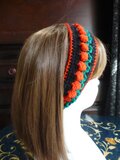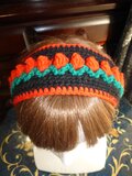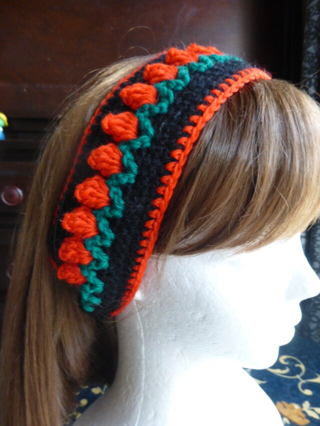 黒地に赤いチューリップを編みこんだ可愛いかぎ針編みのヘアバンドです。赤い糸で縁取りをしています。糸はウールの並太糸です。