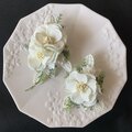 ファブリック調のバラとリーフをメインに、ナチュラルな印象の中にも、ホワイト&グリーンの組み合わせで品よくまとめたコサージュに仕上げました。
