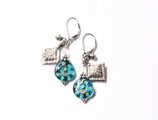 月と星の模様が施された聖者のビーズと、水晶、アフガンパーツ、小さな鈴を繋いだピアスです。
