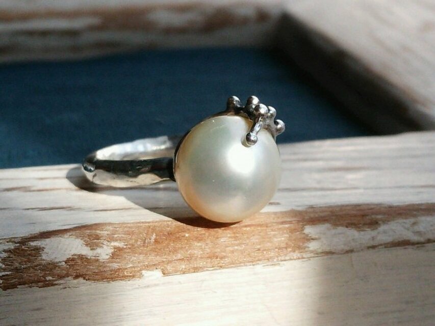 ナチュラルホワイトカラーの南洋パールをセットしたシルバーのリングです。