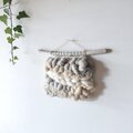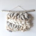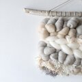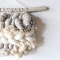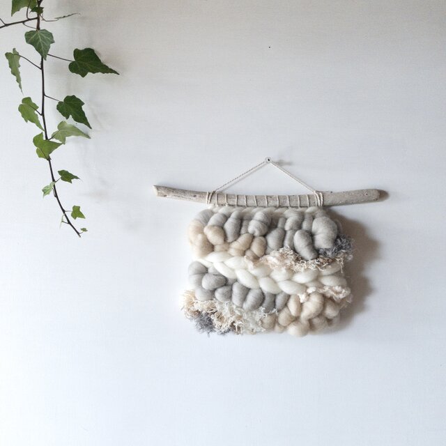 ミルクホワイトにベージュ、ウォームグレーなどの柔らかなお色の羊毛やモヘア、コットン、ファンシーヤーンなど様々な素材を組み合わせ、シナモンやカルダモン、クローブなどのスパイスが香るホットスパイスミルクをイメージしたタペストリーに仕上げました。