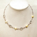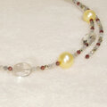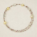 照りの綺麗な淡いイエローの本真珠(淡水パール)、光沢感と透明感の綺麗な丸みのあるグリーンクォーツ、きらきらと輝く多面カットのロードライトガーネット、ラブラドライト、ヘマタイト(ゴールド色のメッキ)のブレスレットです。