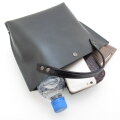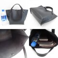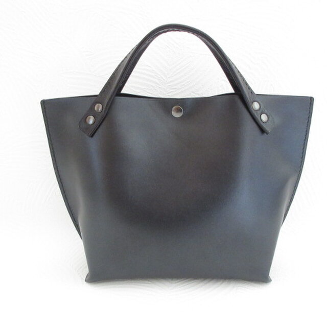 ◎両サイドの底マチの幅を広く取り扇状のシルエットにマッチする幅広でショートなハンドルを