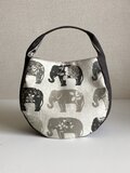 の生地を使って持ちやすいワンハンドルの丸いしずく型のカジュアルバッグに