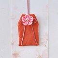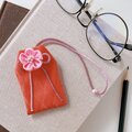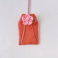 お守り袋にはサテンで作ったピンクの花をあしらいました
