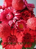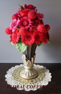 クラッシクな陶器の花器にバラ、ガーベラ、アネモネのレッド系の花だけでアレンジしました。