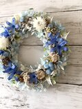 ブルースターとシルバーデージーを淡いブルーのアジサイと合わせた爽やかなリースです。