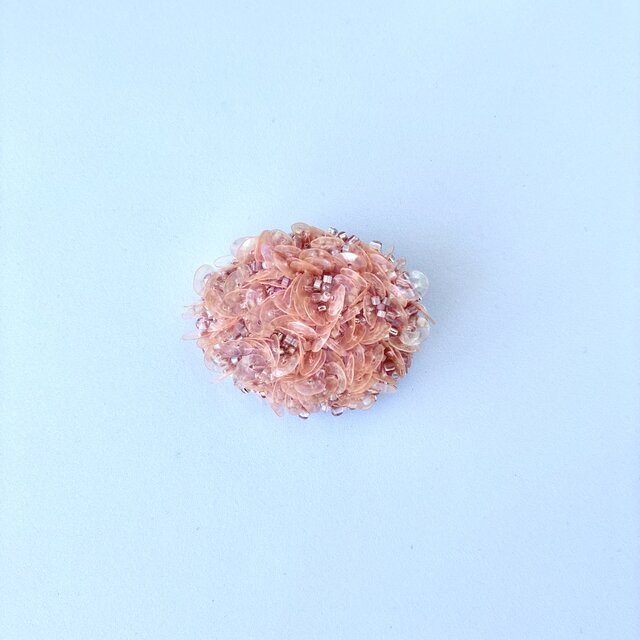 スパンコールの中には、輝き、色味、形の異なるガラスビーズを散りばめ、刺繍の丸いステッチも入っています。とてもかわいらしさのあるブローチです。