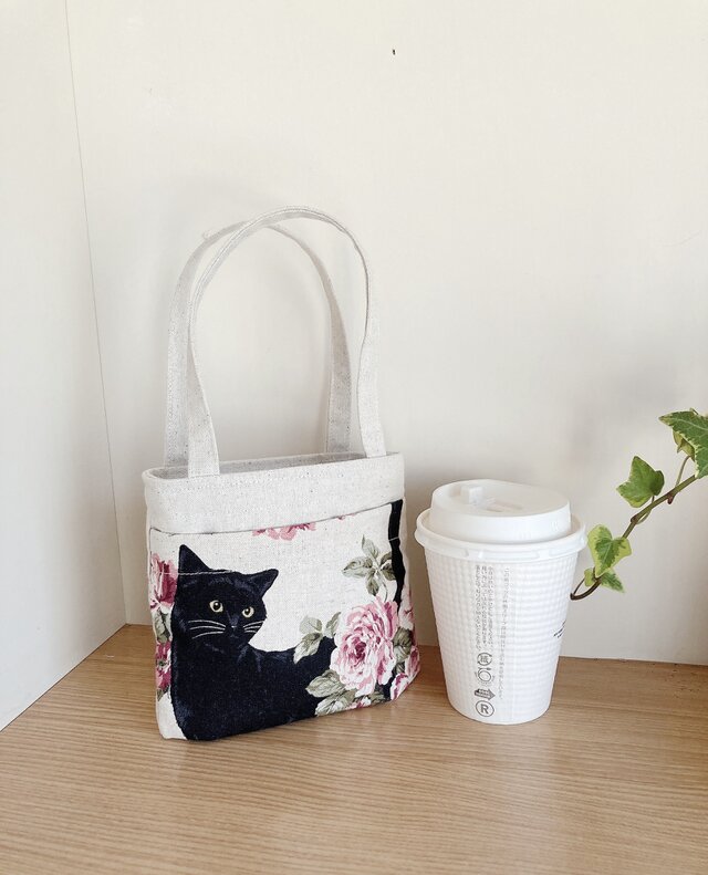 超便利☆コンビニコーヒー収納ミニトートバッグ(大)*黒猫と花