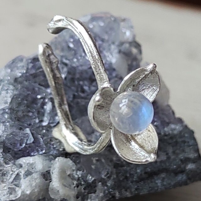 赤い実のツルウメモドキとは対照的なイメージの青白く輝くホワイトラブラドライトを実に見立てたイヤーカフ*耳上部の薄い部分を差し入れて厚みのある耳たぶ付近の位置まで下ろして着ける脱落し難いタイプ、実物の殻や蔓の型を取りリアルに製作した本体はアンティーク調マット仕上げ*通常、黒化遅延処理を施しますが銀そのものの変化をお好みの場合は処理不要とお申し付けください*黒化防止ロジウムやK14・K18・K18lunapink コーティングも承ります(別途800円)