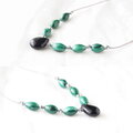 艶やかなブラックのモリオンに縞模様が入った鮮やかなグリーンのマラカイトを合わせ、アクセントにシルバー色のヘマタイトを添えてグレー色のポリエステルコードで繋いだシックな雰囲気のショートネックレスです。