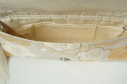 梅模様が可愛らしく、シルバーの華やかさがありつつも、上品な輝きを放つ美しいシルク帯で作られたバッグはしっとりした落ち着きと存在感があります。