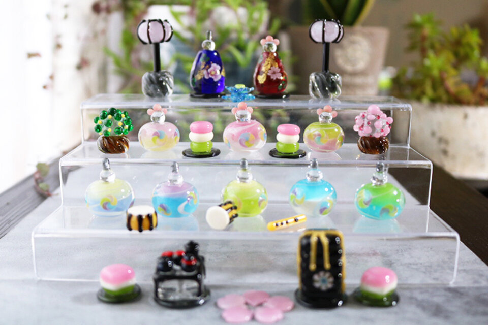 雪洞や菱餅、桜橘、楽器、重箱やお膳なども全てガラスでひとつひとつ丁寧に制作いたしました。