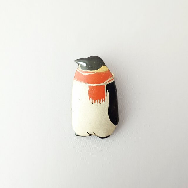 マフラーをした 皇帝ペンギンの親の漆ブローチ。