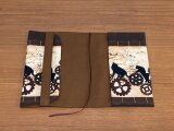 シルエットの猫たちが、機械仕掛けの乗り物に乗って、時を遡る旅をしているような布で、文庫本のブックカバーを作りました。