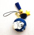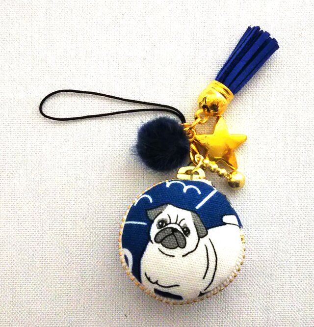 のんびりお散歩ラブリーパグちゃん柄ネイビーの綿オックス生地のマカロンポーチストラップです。