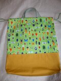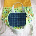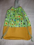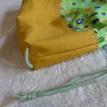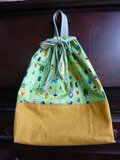 虫柄のオックス生地と黄色の帆布を合わせたお着替え入れ巾着袋です。