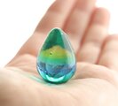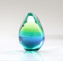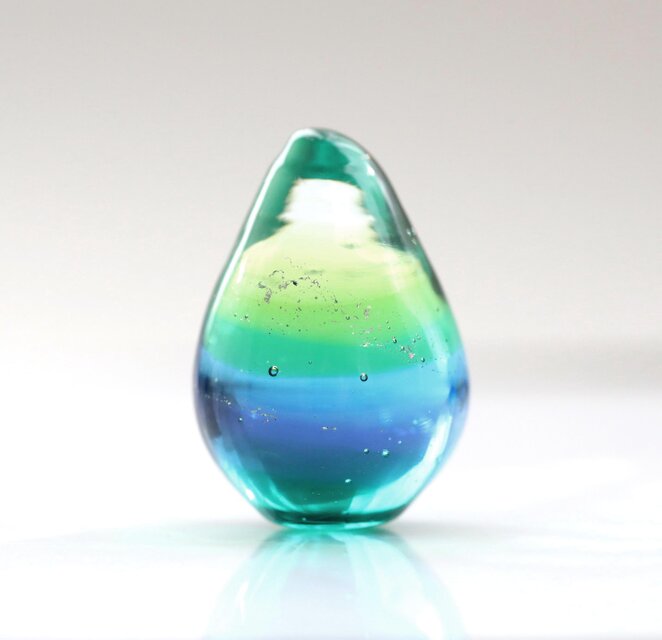 今回制作したものはブルーのガラスの比率が多めだったため、小川の流れる森の中の新緑のような深みを持つ一粒に仕上がっています。