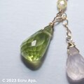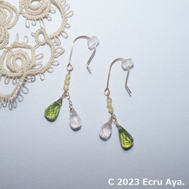 素材:宝石質ローズクォーツAAA ペアシェイプブリオレットカット、宝石質ペリドットAAA ドロップブリオレットカット、宝石質ジルコンAAA 極小ラウンドカット、その他すべて14kgf