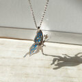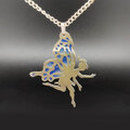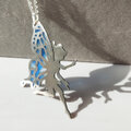 エルフが舞い降りた形を銀板を糸鋸で1点ずつ手で切り抜いて、羽根の部分はエナメルで着色・焼成しています。