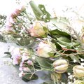 花材:ユーカリ(2種類)、バラ、カスミソウ、ニゲラ、スターチス