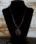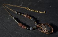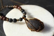 コロンとした大き目のチンターマニストーンをアンティークゴールドのワイヤーで巻きました。同じく隕石のアグニマニタイト、火山のマグマであるラヴァストーン、霊媒師たちの守り石シャーレンブレンド、宇宙意識と繋がるシュンガイトを組ませました。